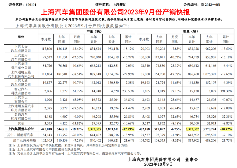 前三季度,上汽集团整车产量为339.7万辆,同比下跌12.29%;整车销量为337.7万辆,同比下跌10.42%。