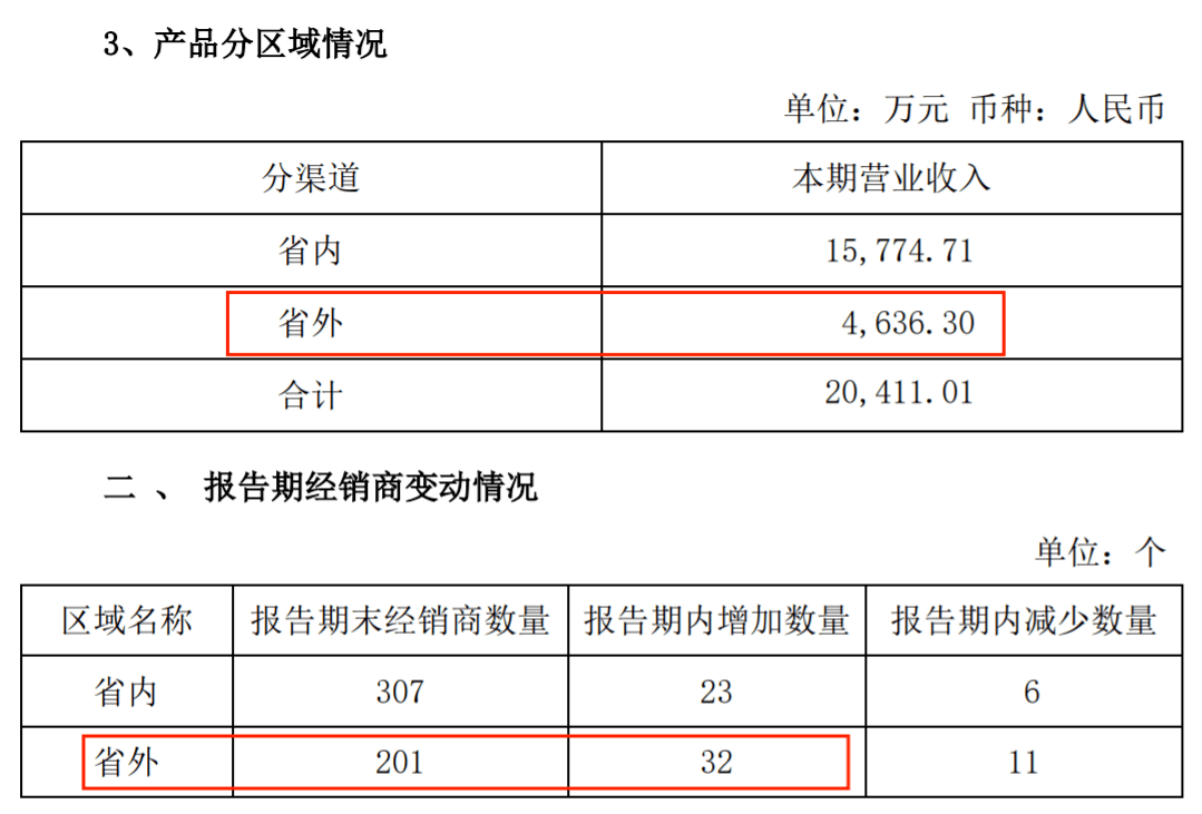 如此,更不必提金种子全国化的难题,即便公司设立河南大区、苏沪大区、江西大区和省外大区,但201家省外经销商仅贡献4636.30万元营收,足可见“再创新辉煌”仍需很长一段时间。