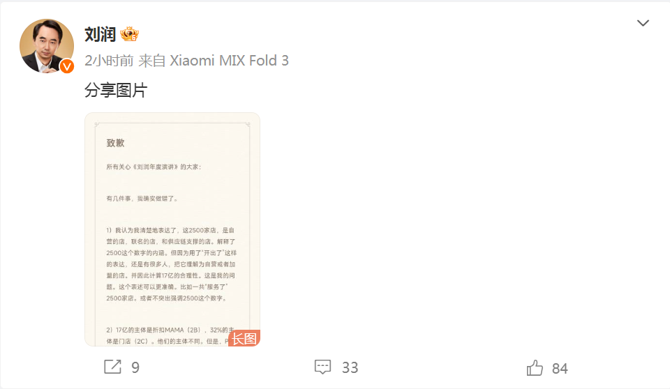 第四次回应则是在11月2日,刘润通过其个人微博发文解释并致歉,承认「有几件事,我确实做错了」。刘润称,「调研完案例,我和创始人确认后,没有实地验证数据,或者和同行交叉验证数据。这是大家质疑最大的点。这是我的错。」