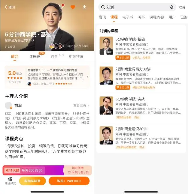 2016年,已经小有名气的刘润受罗振宇邀请加入得到,打造了《5分钟商学院》课程,课程在得到上热卖。根据得到上的数据,刘润的《5分钟商学院基础》售价249元,《5分钟商学院实战》售价199元,仅这两门课就有超过55万人购买学习。刘润和得到证明了,书中自有黄金屋,仅一个人就凭两门课程卖了上亿元。