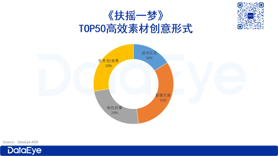 根据ADX数据,《扶摇一梦》手游买量素材计划数TOP50(下称“高效素材”)创意类型如下。