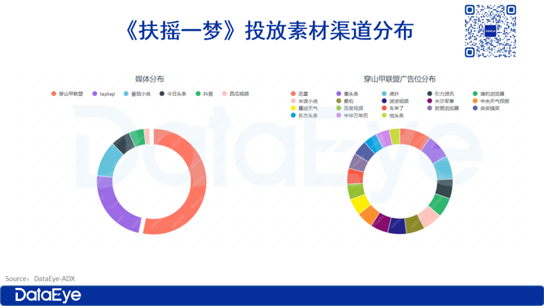 从渠道来看,《扶摇一梦》侧重字节系平台,投放占比高达70%以上,其次是TapTap,占比在23%左右。