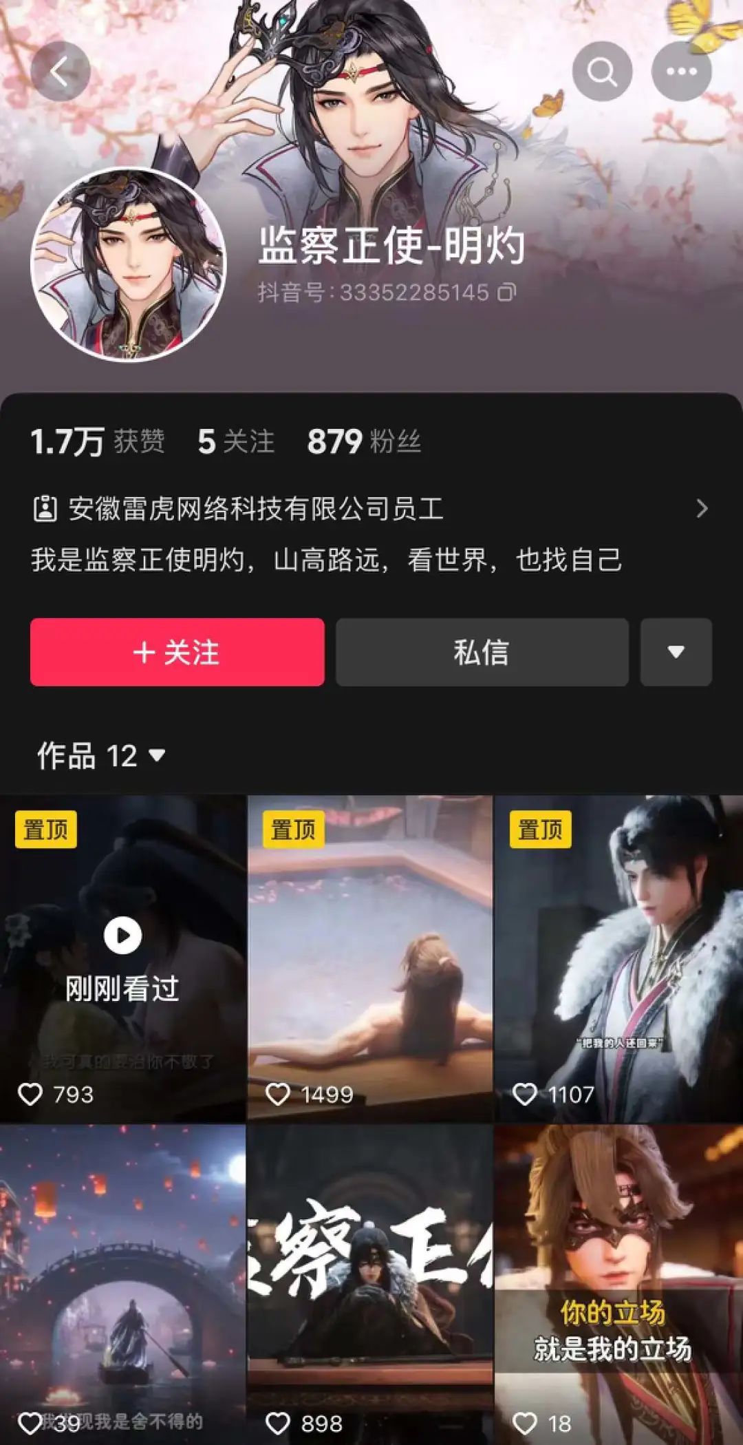 在b站上,官方发布的视频以角色介绍和配音为主,目前最高播放的视频为“监察正使-明灼”的介绍信息。我们关注到,在抖音上,项目组为“六大人物”搭建了抖音官方账号,发布游戏内相关剧情内容,目前“监察正使-明灼”人气最旺。