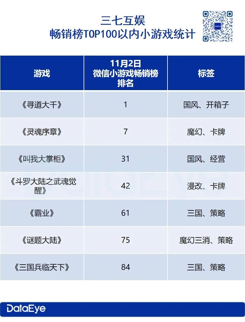 加上《寻道大千》《叫我大掌柜》《三国兵临天下》《谜题大陆》《斗罗大陆之武魂觉醒》,截至11月2号,三七共有7款微信小游戏进入销榜TOP100。