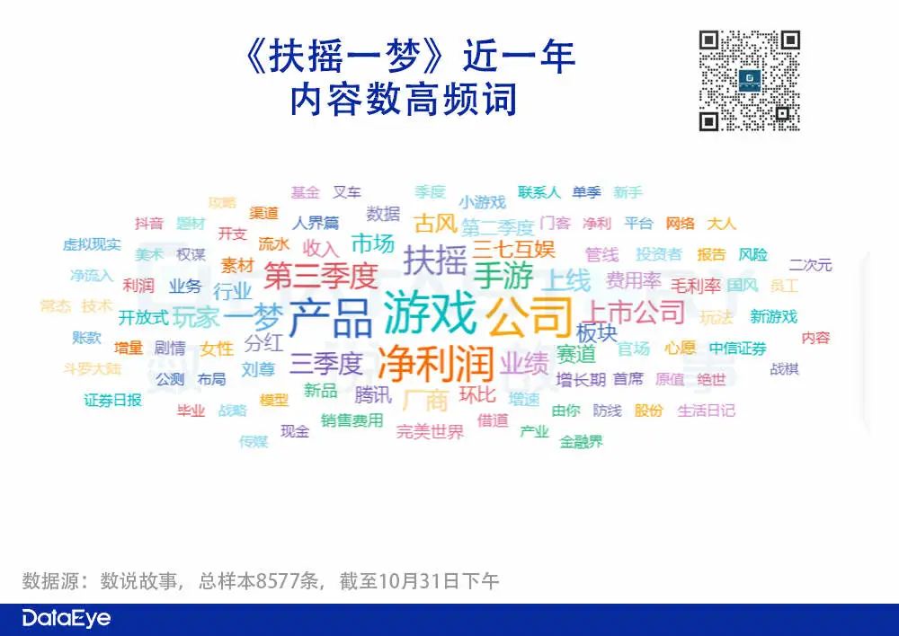 内容高频词方面:除了游戏名外,居多的是三七、业绩相关的词汇;例如“人界篇”、“净利润”、“第三季度”等等。除此之外,也有“剧情”、“二次元”等词汇,与游戏内容、风格强相关。