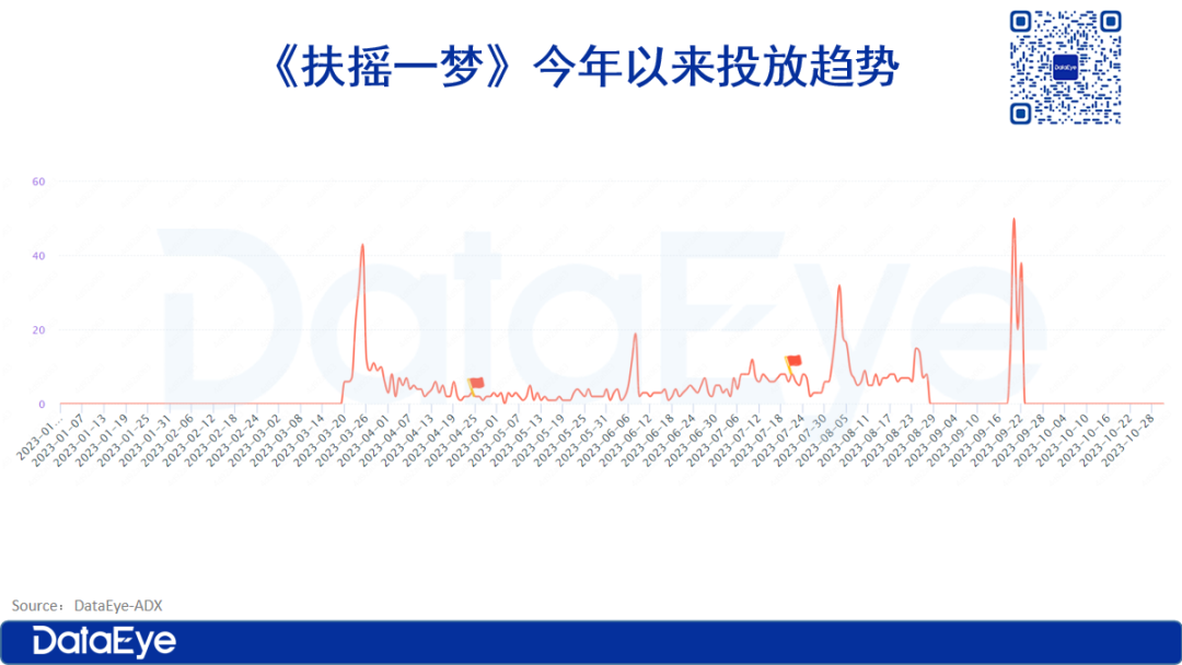 DataEye-ADX投放数据显示,《扶摇一梦》早在今年3月份便开始小规模投放,但预热阶段整体投放量不高,日均投放保持在10组左右。(由于该游戏今日上线,预计应该还有后续投放,目前投放趋势仅供参考。)