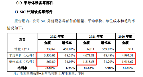 可见,虽然SiC外延设备零部件的毛利率由61.65%升至了73.88%,持续增长,但其获利能力分别为(平均单价-单位成本)3080.89元/件、2755.26元/件、2460.94元/件,持续下滑。