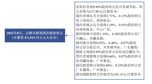 钛媒体APP注意到,除了外部投资者增资以外,2022年4月,志橙股份的员工持股平台共青城喜橙、共青城和橙分别以32.05元/注册资本和51.03元/注册资本的价格对志橙股份进行了增资。