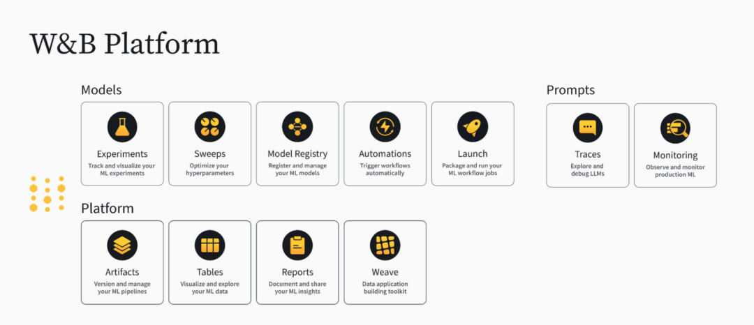 W&B Models主要对模型训练阶段进行管理,具有包括实验追踪、模型管理、ML工作流程规模化和超参数优化等功能。