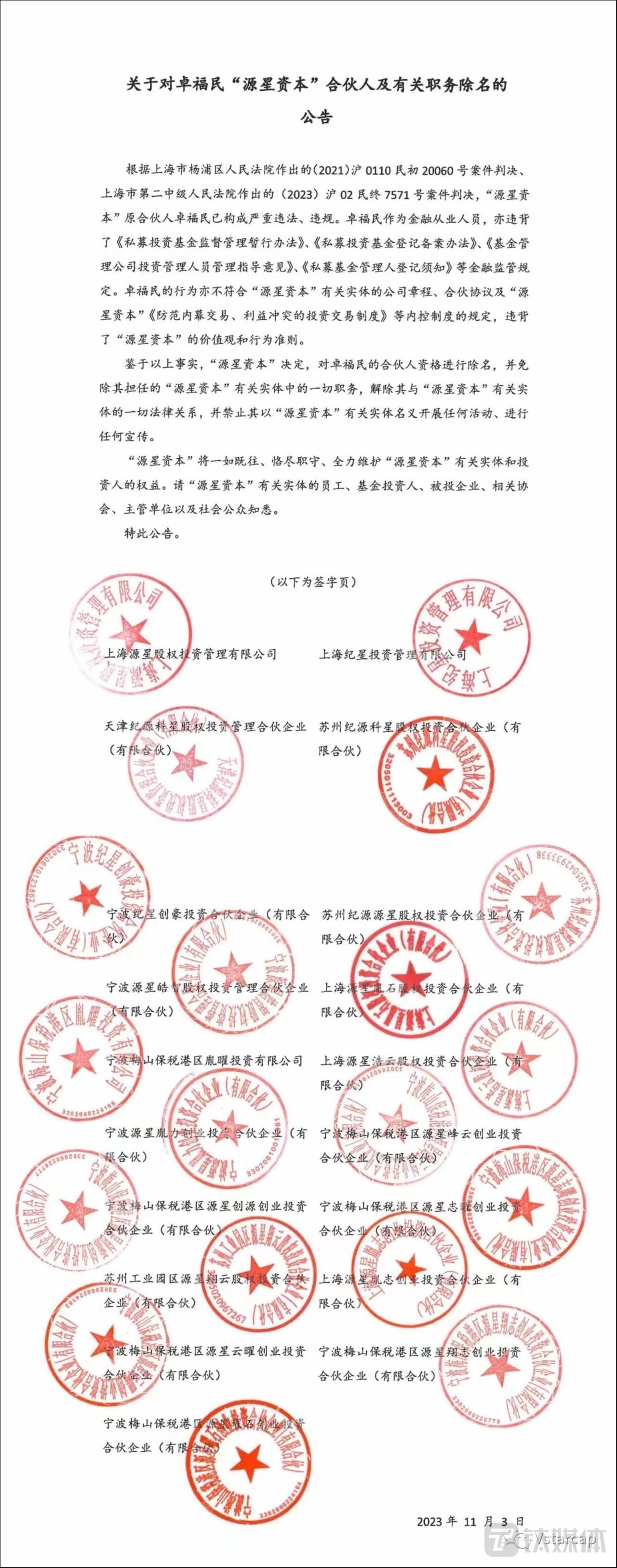 公告称,根据上海市杨浦区人民法院作出的(2021)沪0110民初20060号案件判决、 上海市第二中级人民法院作出的(2023)沪02民终7571 号案件判决,“源星资本”原合伙人卓福民已构成严重违法、违规。卓福民作为金融从业人员,亦违背了《私募投资基金监督管理暂行办法》等金融监管规定。卓福民的行为亦不符合“源星资本”有关实体的公司章程、合伙协议及“源星资本”《防范内幕交易、利益冲突的投资交易制度》等内控制度的规定,违背了“源星资本”的价值观和行为准则。鉴于以上事实,“源星资本”决定,对卓福民的合伙人资格进行除名,并免除其担任的“源星资本” 有关实体中的一切职务,解除其与“源星资本”有关实体的一切法律关系,并禁止其以“源星资本”有关实体名义开展任何活动、进行任何宣传。