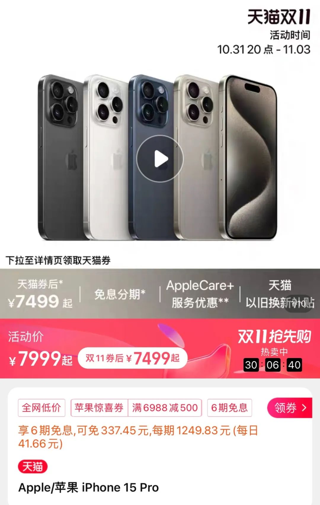 《凤凰WEEKLY财经》注意到,目前在Apple京东自营旗舰店领券之后,iPhone 15系列手机最高可优惠800元左右。在Apple Store天猫官方旗舰店,iPhone 15、iPhone 15 Plus可享满5688元减700元的活动,iPhone 15 Pro和Pro Max则满6988元减500元,并且6期免息。