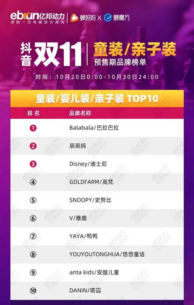 目前,森马服饰的童装已经恢复净开店,童装收入也已经恢复正增长。根据亿邦动力10月31日发布的抖音双十一童装预售期品牌榜单,巴拉巴拉排在首位,安踏儿童排在第九位。