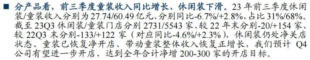 森马服饰三季报中没有披露童装业务具体的数据,但东吴证券研报的数据显示,2023年前三季度森马服饰的童装收入为60.49亿元,同比增加2.8%;而2023年中报披露童装收入为38.25亿元,计算得知童装业务在第三季度收入为22.24亿元。