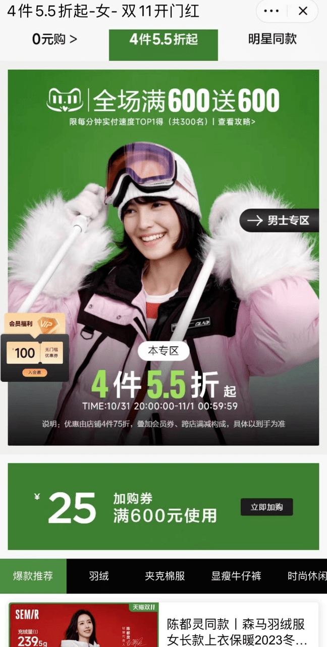 10月31日晚8点,双十一付款正式开启。「界面新闻·创业最前线」注意到,森马服饰也通过“打骨折”的方式来促销清库存。以森马天猫官方旗舰店为例,公司推出专区服饰4件5.5折起的活动,打折服饰包括春秋装、夏装、冬装,不少打折服饰并没有标明是2023年新款。