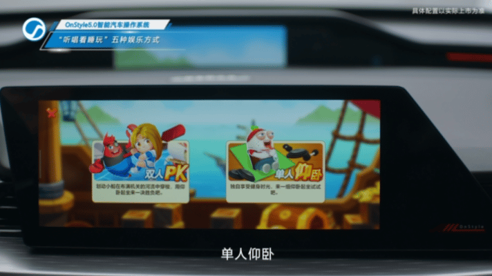 此外,OnStyle智慧快乐座舱还推出了新颖的健身房功能。当你唤醒该功能时,车内座椅会自动调节到适合健身的位置,且屏幕营造一个沉浸式车载体感类的划船游戏,让你的身体跟随游戏进行简单的仰卧起坐,在健身之余还体验了一把游戏的快乐。