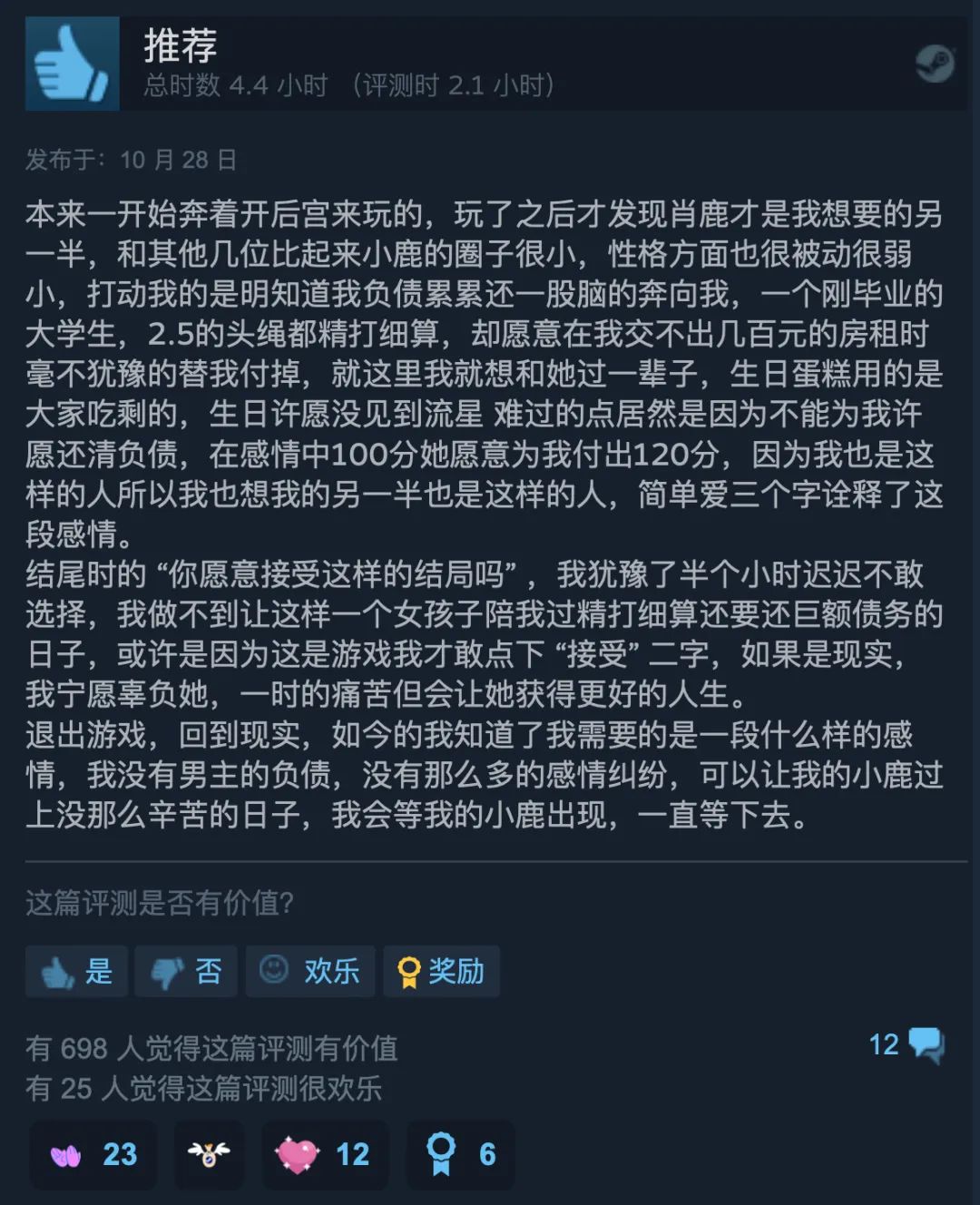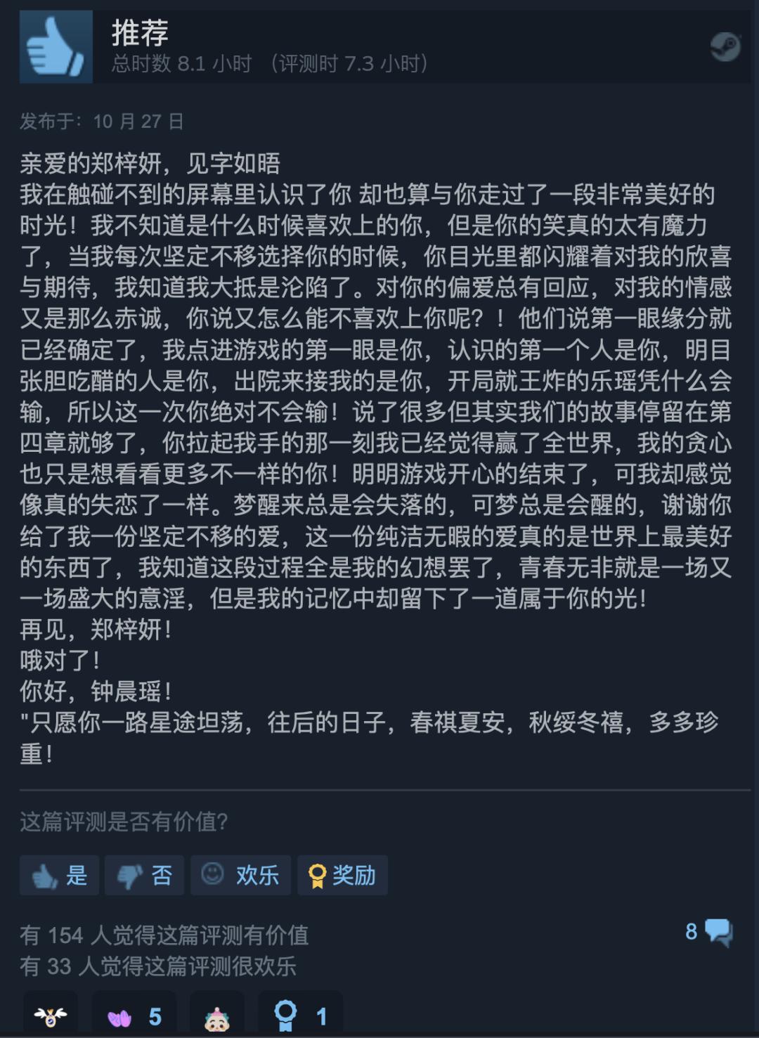 游戏上线后,这样一句短短的评论被顶到了Steam评论区前排:“因为我的青春太安静了,我想看看别人的青春中明目张胆的偏爱。”很多人在这里写下长长的心路历程,用老派的方式书写情书一般的告别信,感谢游戏里被自己选择、也毫无保留关心自己的角色。
