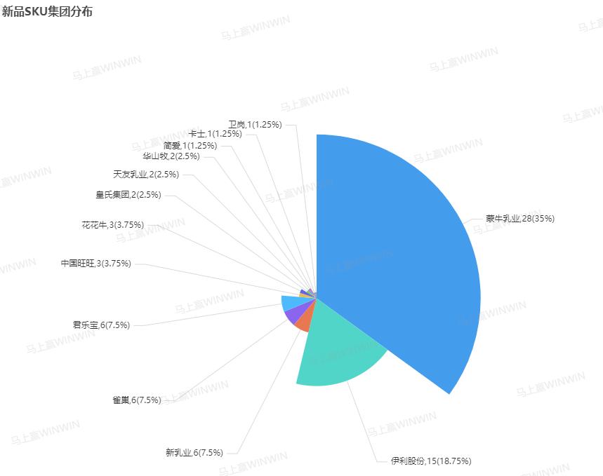 从集团分布来看,乳制品市场内企业间新品研发能力差距较为显著。蒙牛、伊利虽同为老牌头部乳企,但三季度推出的新品数量却几乎相差一倍。在日前公布的上半年财报中,蒙牛2023H1总营收511.19亿,同比增长7.12%,下半年保持增速的话则在今年可达千亿目标,三季度的新品推出数量大幅领先也侧面显示出蒙牛今年破千亿的决心。除去这两家头部企业,其余乳企在这一季度内推出的新品SKU数均为个位数。可见,乳制品赛道内大多数企业目前的策略为打造某一细分品类的大单品以稳固自身市场地位,唯有蒙牛、伊利等老牌企业方有余力多栖发展。