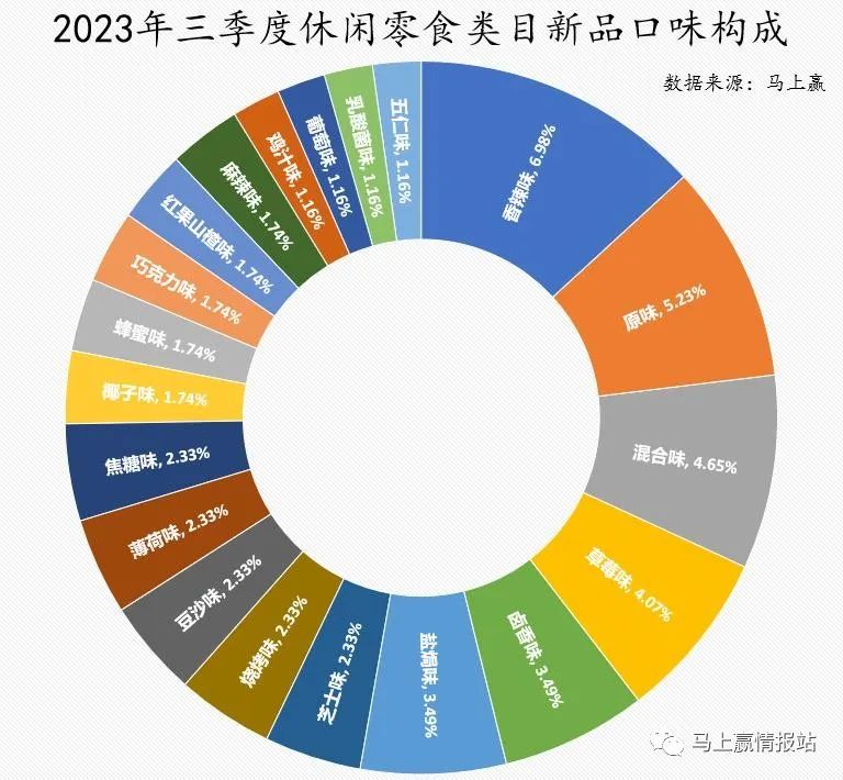 口味上看,不同于饮料类目内原味一家独大的状况,休闲零食中香辣味以近2%的优势超过原味,混合味、草莓味、卤香味、盐焗味等则分别以细微的差距紧跟在后。总体来看,休闲零食赛道内新品以传统强势口味为主,小众猎奇的口味较少,相对来说比较中规中矩。
