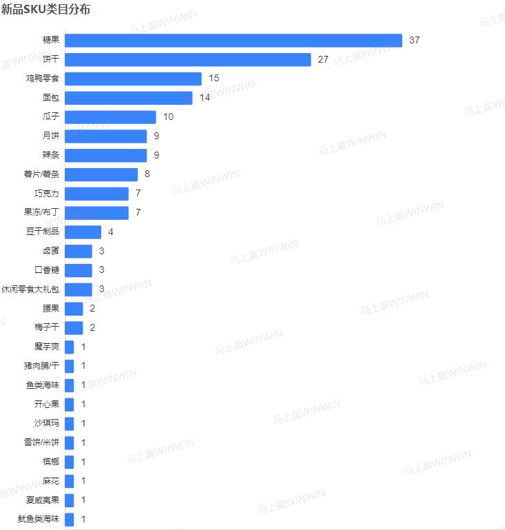 休闲零食赛道内竞争的激烈程度从新品SKU的类目分布情况上便可见一斑,无论是类目的数量还是总体新品SKU的数量均遥遥领先其他类目。具体来看,休闲零食中糖果以37款新品SKU名列第一,饼干以27款新品紧随其后,二者与其余品类拉开较大差距,构成第一梯队,这两者的市场份额在整个休闲零食类目中也处于头部位置;而鸡鸭零食、面包、瓜子、月饼等则以10款左右新品扛起第二梯队的大旗。在我们之前的市场观察中,糖果在休闲零食赛道内的市场份额及其增速数据均十分亮眼,但品牌集中度低、市场份额分散,这在一定程度上为糖果企业进行创新提供了良好的环境和突出重围的空间。