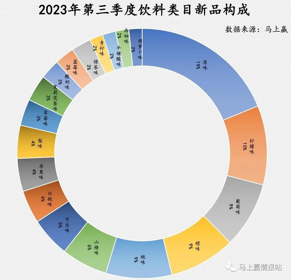 从产品口味与类型的角度看,原味以12.57%的优势在新品SKU中占据大头。原味即根据不同的产品类型与配料,主要凸显其产品本来味道而非风味,可见本位调味、轻调味正逐渐流行。除此之外,柠檬味也向来在饮品口味中有自己的一席之地,但从这一期的数据来看,其第二名的地位正受到桃味、橙味、葡萄味等果味的挑战,差距正逐渐拉小。从图中来看,其余口味之间的数据差异并不显著,饮料企业在果味上寻求创新的同时也试图探索牛磺酸味、胡萝卜味等更加新颖小众的口味以博取消费者关注。