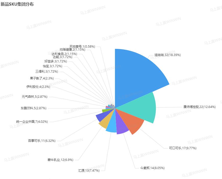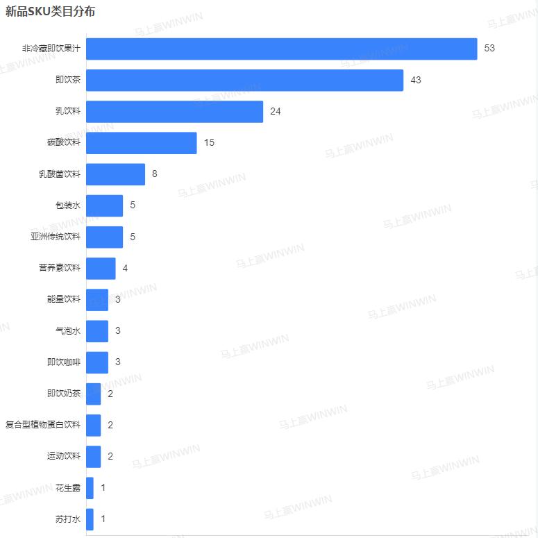 根据马上赢「新品数据库」数据,饮料这一赛道中的新品SKU以非冷藏即饮果汁和即饮茶为主,二者占饮料总体新品SKU约55%,数据十分可观。其中,非冷藏即饮果汁较特殊,出现很多老品换装、条码更新等情况。而乳酸菌饮料、气泡水、即饮奶茶等曾经红极一时的类目如今新品数量仅为个位数。我们认为,在线下户外消费市场复苏的大趋势下,消费者对饮品是否健康的重视以及对便捷化“水替”的需求均推动了饮料市场对即饮茶的重视。另一方面,即饮茶作为饮料市场中的新星,其市场尚不饱和,已有SKU相对偏少,这也为企业进行产品创新、满足消费者多元化的需求留出了充足的空间。