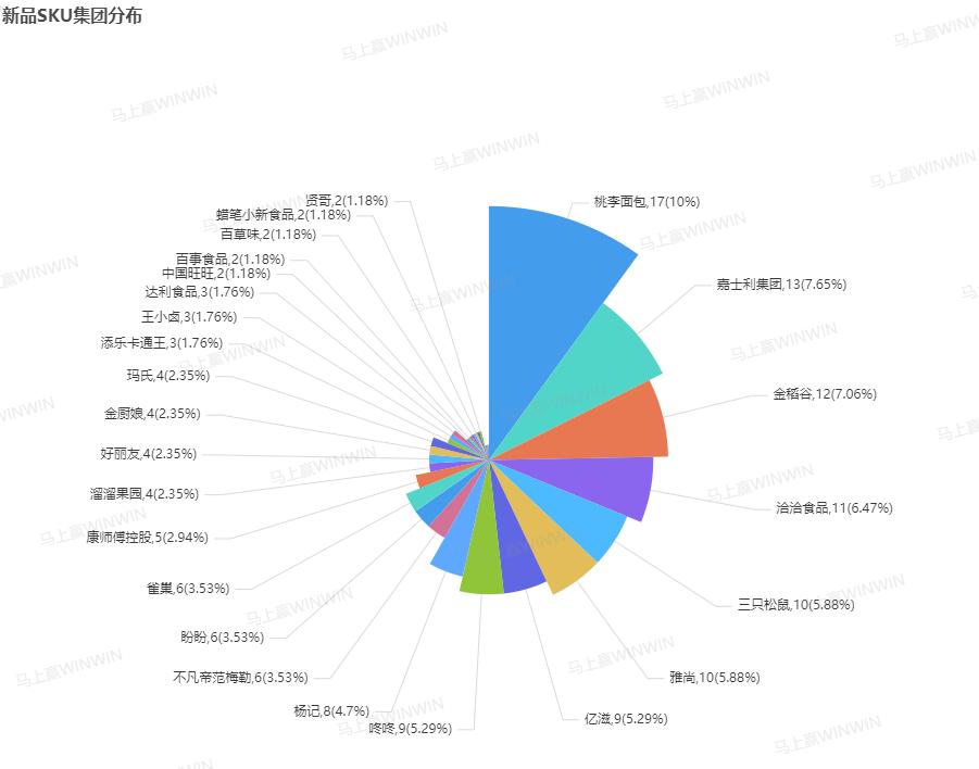 在分析新品SKU类目分布的基础之上看新品SKU集团分布数据,一些有意思的结论就呼之欲出了。尽管休闲零食内部企业的业务多有交叉重合之处,但从集团主营业务的角度切入,不难发现分别推出17、13款新品的桃李面包、嘉士利集团均属于大型饼干面包制造商,推出12款新品的金稻谷主营糖果,推出11款新品的洽洽食品则因其瓜子、坚果类产品而广为人知。由此,我们或许可以说:饼干面包等新品大多由头部企业推出,新品牌的产品创新能力目前来看有待加强;而糖果这一细分品类内部虽有大量新品涌现,但头部企业新品数量占比则相对较低,新品牌的活力正旺。