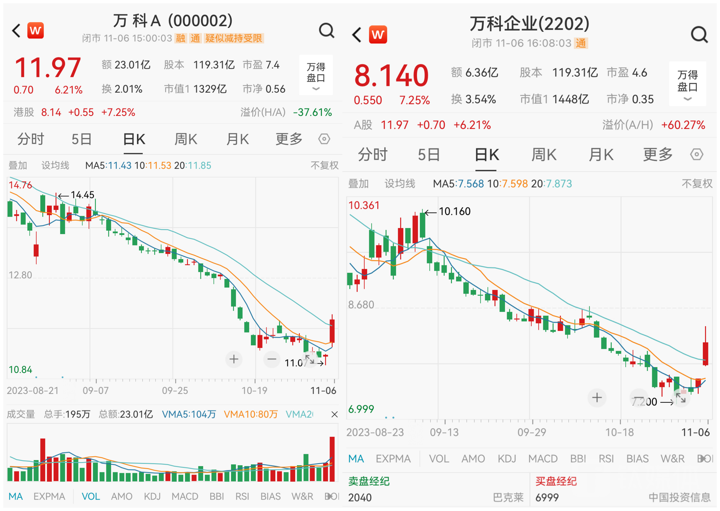 此外,截至今日股市收盘,万科A(000002.SZ)股价报收11.97元,涨6.21%,当前公司总市值约1428.11亿元;H股方面,万科企业(02202.HK)股价报收8.14港元,涨7.25%,当前公司总市值约971.16亿港元。