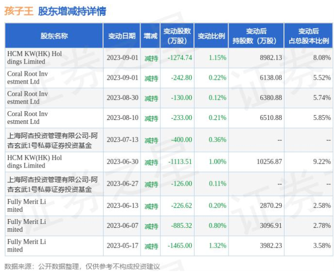 11月1日,孩子王再次发布公告表示,其股东上海阿杏投资管理有限公司-阿杏玄武1号私募证券投资基金、Coral Root Investment Ltd于2023年6月20日至2023年9月1日间合计减持1131.8万股,占公司目前总股本的1.0177%,变动期间该股股价下跌20.66%。据证券之星数据,孩子王近半年内有股东持股变动,合计净减持6096.99 万股。
