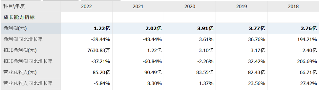 2021年,孩子王实现营收90.49亿元,同比增长8.30%;净利润2.016亿元,同比下滑48.44%。到了2022年,孩子王营收转为负增长,同比下滑5.84%达到85.20亿元;净利润1.22亿元,同比下滑39.44%。