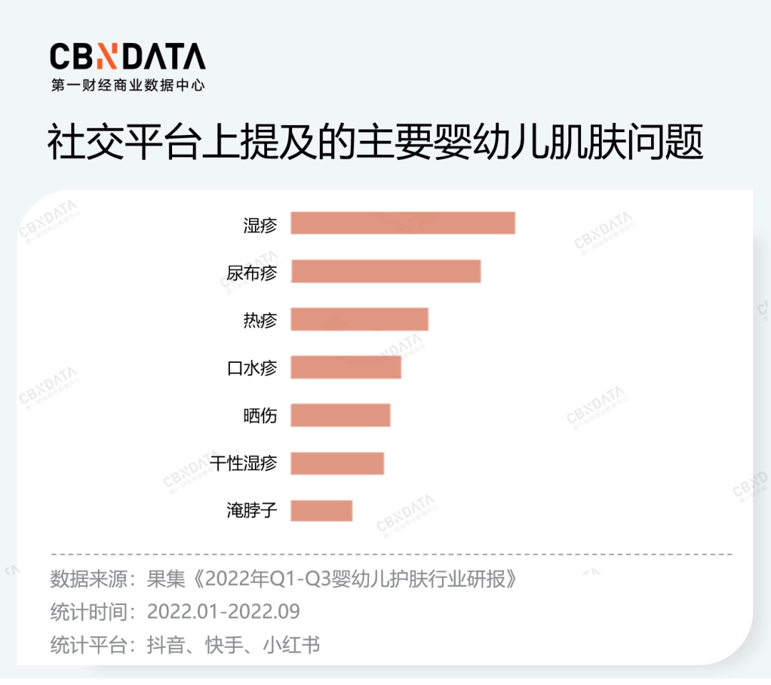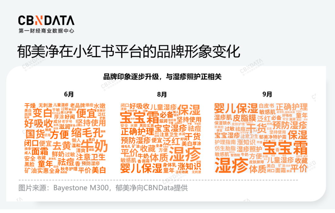 精细化育儿趋势下,消费者对于婴童皮肤护理也产生新的需求。社交平台数据显示,湿疹是婴幼儿较常见的肌肤问题,湿疹肌的修复因而受到消费者关注。功效党、分域护肤理念的风终于吹到了婴童护肤领域。以郁美净为例,其高端新品“照护系列”主打湿疹肌的皮脂修复及止痒功效,并参照成人的精准护肤理念,根据南北方气候差异调整活性物组合。郁美净向CBNData表示,该产品线的推出是顺应当下儿童护肤赛道内分龄、分季、分地域的护肤理念,品牌需要围绕这些新的场景来细化产品矩阵颗粒度。在老国货品牌焕新的大趋势下,该产品一方面为品牌形象的改变提供具体出口,另一方面也拓展了产品价格带,带来高端化可能。
