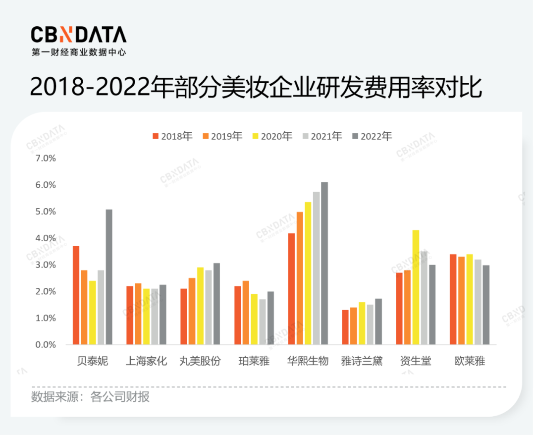 另一方面,国货品牌本身也开始正视自身短板,不断增加产品研发投入,满足本土消费者的诉求。一个最直接的例证是,近年来主要国货美妆企业正在提升自己的研发投入占比,向国际大牌靠拢。
