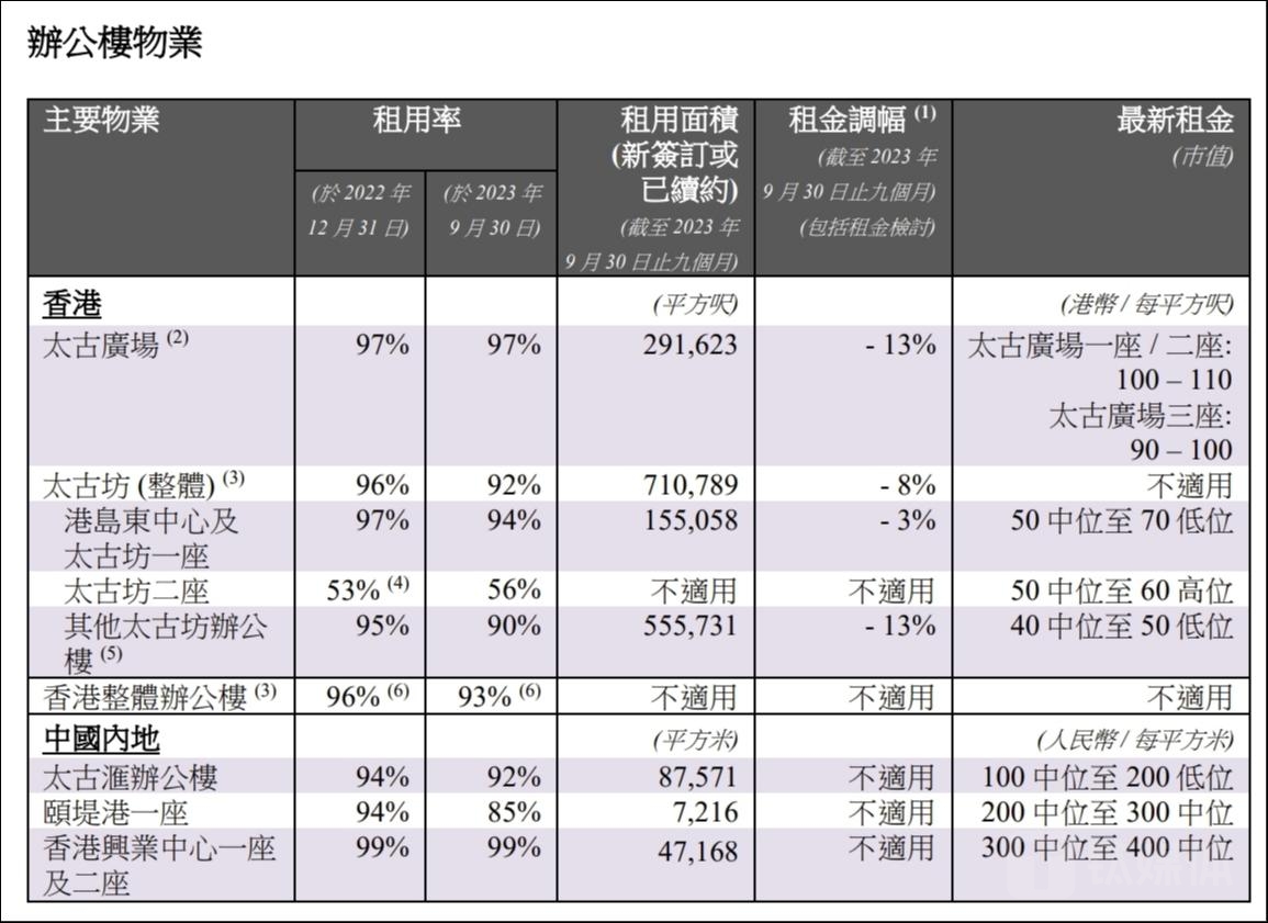 办公楼物业方面,截至2023年9月30日止,香港整体办公楼出租率为93%,同比减少3个百分点。其中,香港太古广场出租率97%,同比持平,租金跌13%;太古坊(整体)出租率跌至92%,去年底为96%,租金跌8%。