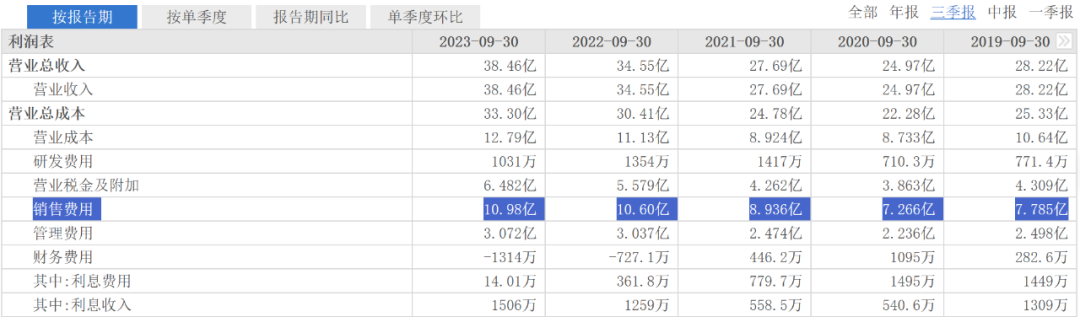 财报显示,2020年三季度至2023年三季度,老白干酒的销售费用分别为7.266亿元、8.936亿元、10.60亿元及10.98亿元。半年报中曾披露了今年上半年销售费用的具体支出途径,其中广告及促销费用高达3.18亿元,约占销售总费用的46.22%。此外,公司前三季销售费用率达28.56%。2020年-2022年,老白干酒的销售费用率分别为28.4%、30.7%、30.3%,在行业内排名靠前。