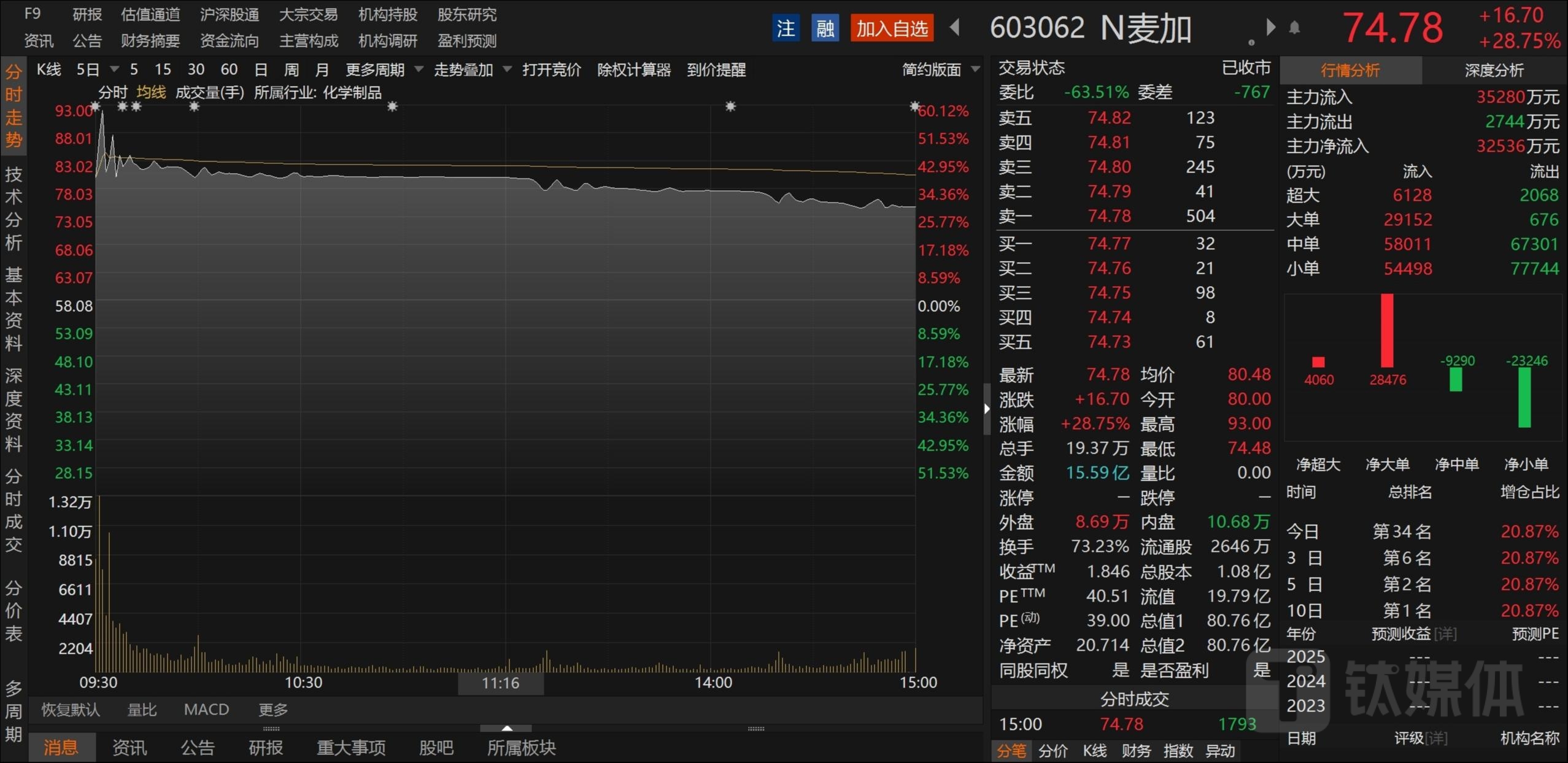 开盘首日,麦加芯彩每股最终发售价格为58.08元,截至当日收盘,公司股价报收74.78元,涨28.75%,成交额为15.59亿元,当前公司总市值约80.76亿元。