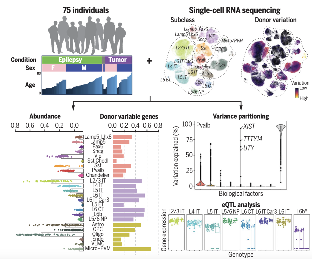 除了区域差异性外,脑细胞的基因表达还存在个体差异。其中一项研究首次使用单细胞技术比较了大量个体的脑组织后得出了这一结论。在这项工作中,75名因为难治性癫痫或脑部肿瘤而接受外科手术的成年志愿者向科学研究提供了珍贵的大脑皮层样本,研究人员对颞中回的脑细胞类型组成和细胞基因表达的变化展开了详细分析(图5)。结果显示,尽管不同个体之间存在高度一致的细胞构成,但也存在可以反映出个体特征、疾病状况和遗传调控变异的大量变异。这些结果也为未来研究健康和疾病状态下的细胞分型提供了参考[4]。