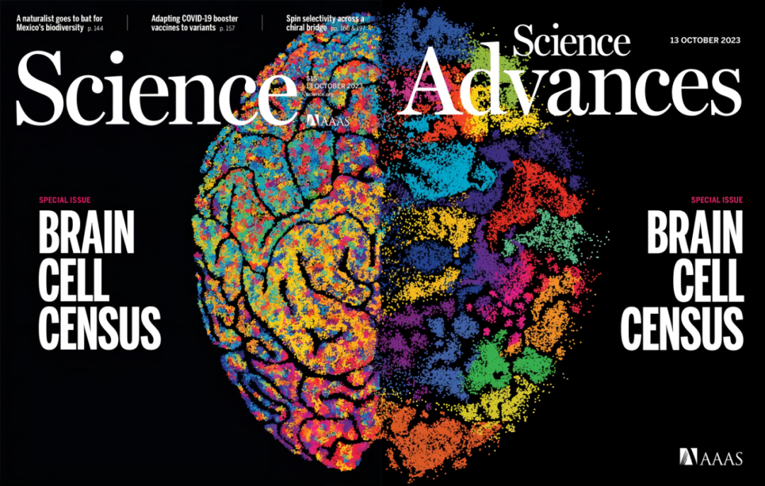 ▷图 1:Science与Science Advances杂志封面合并为一个完整人类大脑图像。图源:Science官网