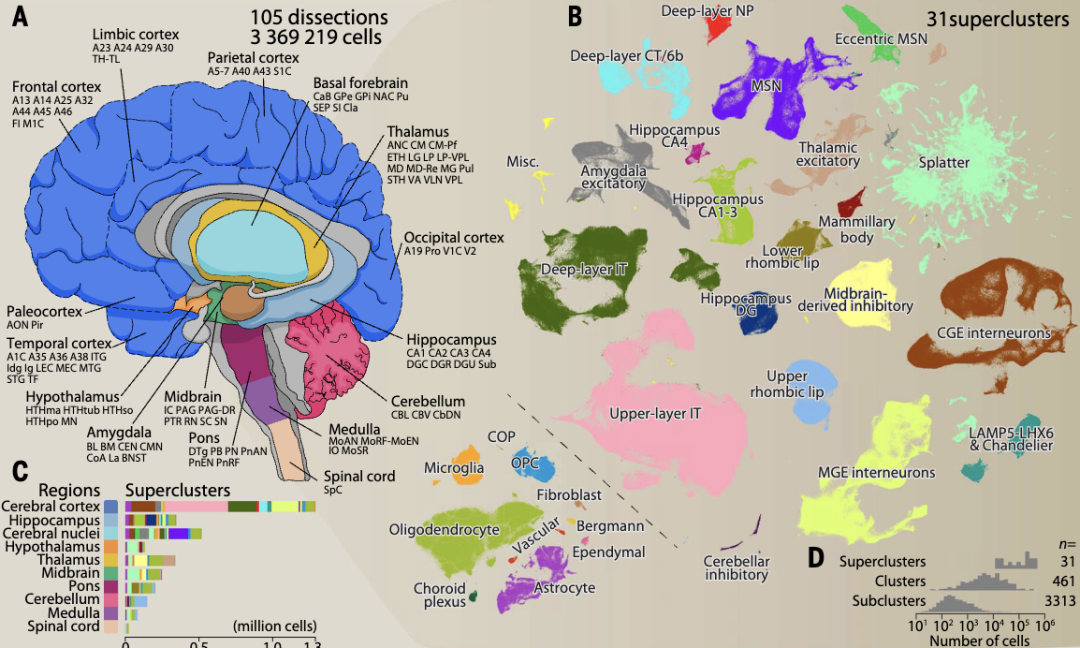 第一个研究由瑞典卡罗林斯卡医学院Sten Linnarsson和荷兰乌得勒支大学医学中心的神经科学家Kimberly Siletti团队领衔[2]。他们从三位死者的前脑、中脑和后脑106个部位采集了300多万个单一细胞进行RNA测序(snRNA-seq),深入研究了脑细胞的多样性和亚型,为整个图谱的建立打下坚实的基础。