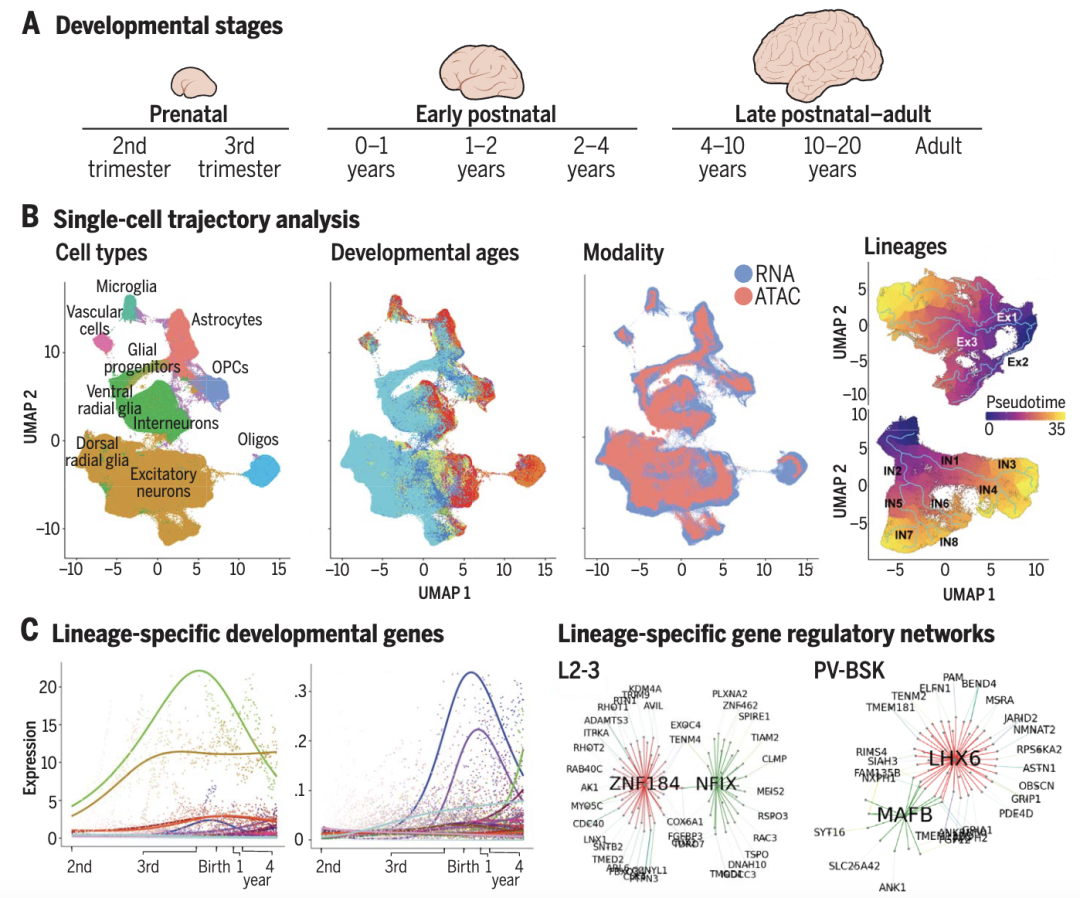 人的大脑皮层在胎儿出生前数月开始发育,并延续到出生后数月。该过程会受到精细调控,不同细胞的生长、分化和成熟,对大脑的复杂结构和功能至关重要。为了跟踪大脑皮层的发育轨迹,美国加利福尼亚大学旧金山分校Arnold R. Kriegstein团队,从不同阶段的人类皮层样本中收集了大量小核RNA测序(snRNA-seq)数据,对产前和产后发育阶段人类皮层样本中生成的单细胞数据进行了单细胞轨迹分析[10]。