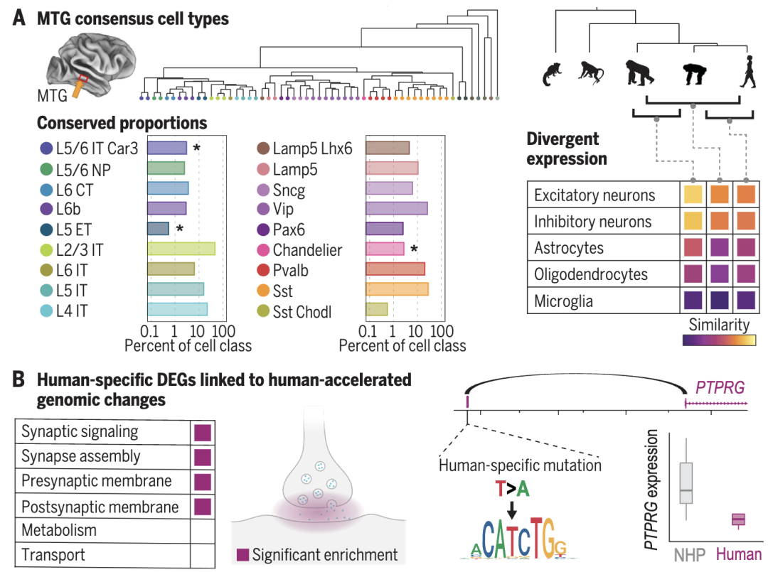 为此,Jorstad等人对成年人类、黑猩猩、大猩猩、猕猴和普通狨猴的颞中回(对语言理解至关重要的区域)进行了单细胞转录分析。他们发现,尽管灵长类动物在很大程度上具有相同的保守细胞类型,但它们在细胞比例方面表现出巨大差异。值得注意的是,尽管一般来说神经胶质细胞的多样性低于物种内的神经元,但与神经元相比,小胶质细胞、星形胶质细胞和少突胶质细胞在物种之间表现出更大的转录差异,并且在转录组中具有更快的进化趋异。只有几百个基因显示出人类特有的表达模式,并且这些基因不成比例地靠近具有人类进化选择迹象的基因组区域。这些结果表明,成年人类皮层的特定特性可能源自相对较少的细胞和分子变化[6](图7)。
