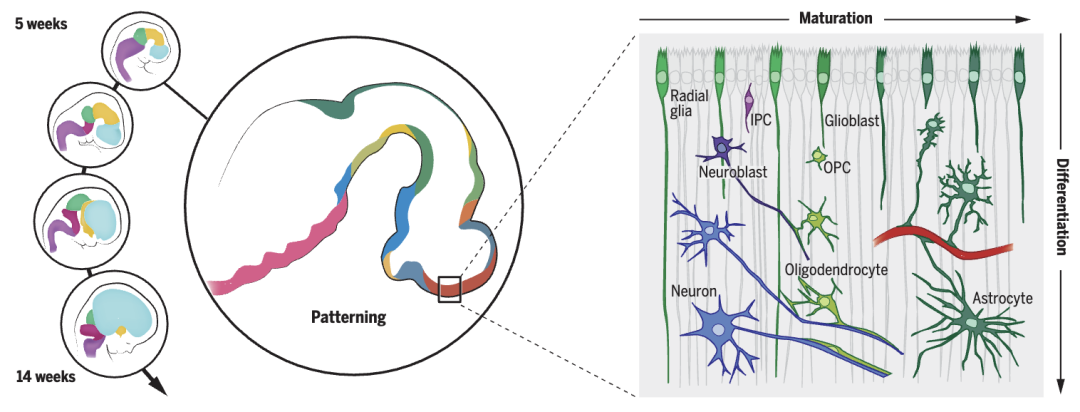 ▷图 11:胚胎前三个月的人类大脑细胞图谱。图源:参考文献[11]