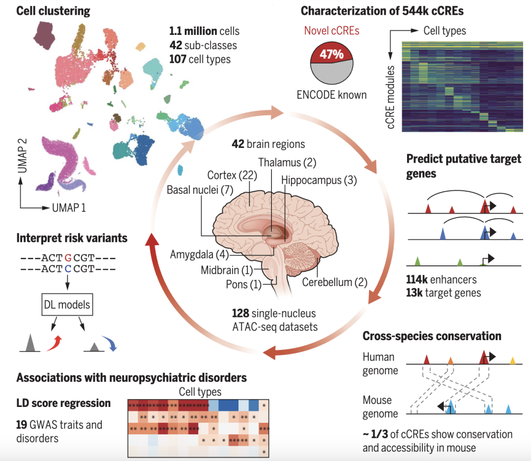 为厘清其中的关系,美国加州大学圣地亚哥分校任兵课题组在单细胞水平上进行了人类大脑染色质可及性的综合分析,涉及42个不同脑区的110万个细胞。他们使用这个染色质图谱定义了107种不同的脑细胞类型,并揭示了这些细胞类型中54万个推定的转录调控元件的染色质可及性状态,以及特定脑细胞类型与精神分裂症、双向情感障碍、阿尔茨海默病、重度抑郁症等19种神经和精神疾病之间的关联。其中近三分之一的转录调控元件在小鼠脑细胞中表现出保守性和染色质可及性,强调了其功能重要性[9]。