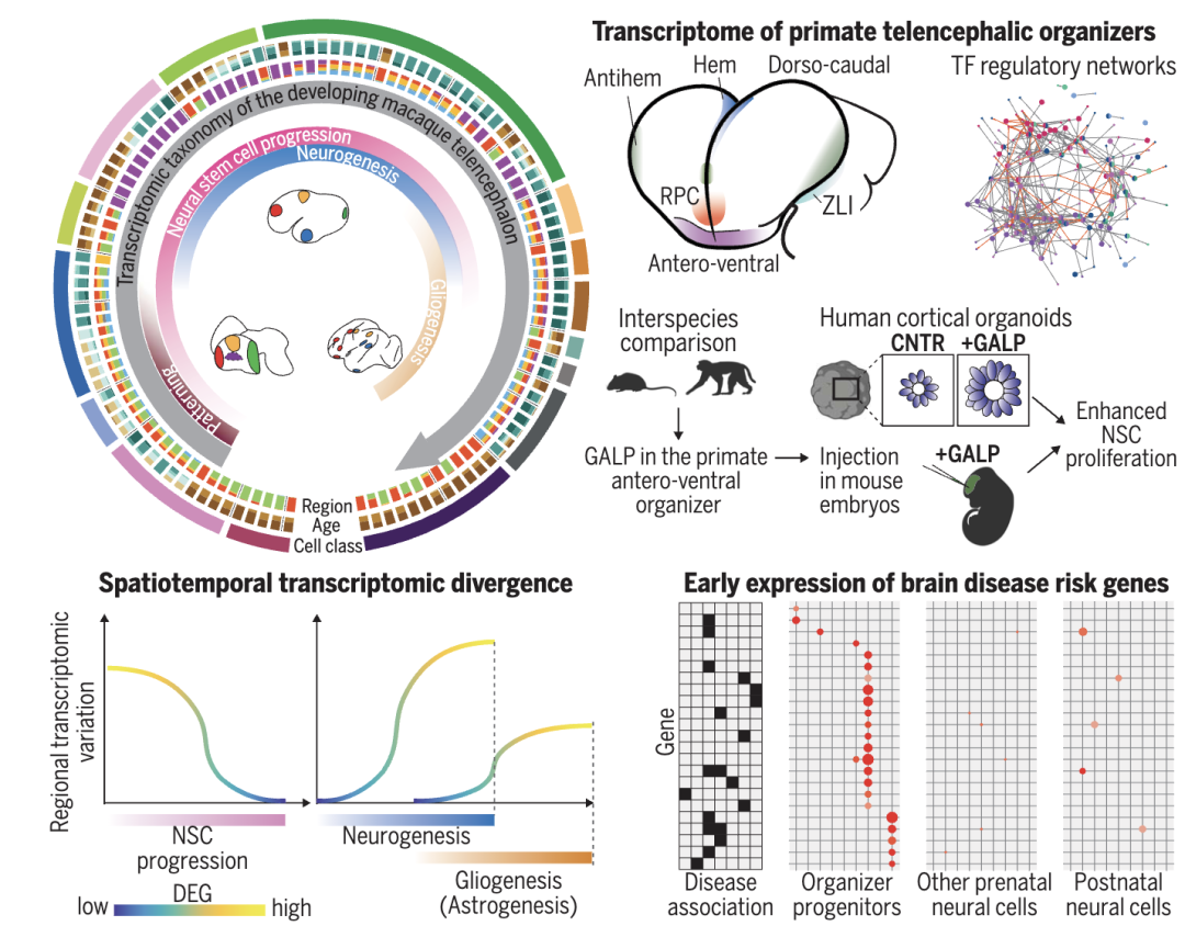 研究团队解剖了恒河猴产前端脑的多个区域,并对76.1万个细胞进行了单细胞转录组测序(scRNA-seq),他们区分了转录组定义的细胞亚型,包括背侧和腹侧神经干细胞、兴奋性和抑制性神经元、胶质细胞和非神经细胞,并描述了它们在谱系发育过程中跨区域的分子动力学特征。不仅确定了端脑组织中心的早期祖细胞,还预测了协调其模式功能的基因调控网络,包括ZIC转录因子。