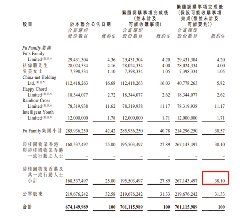 若两笔交易完成后,碧桂园服务在合富辉煌中的持股比例将由原来的25%提高到38.1%,跃升成为第一大股东。
