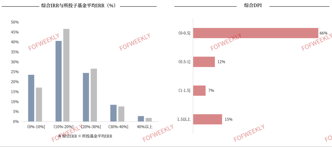 LP之所以对管理费的收取模式提出这样那样的要求,核心原因还是在于其对投资回报的信心不足,因为这些年,投股权产品的回报确实相对一般。根据FOFWEEKLY《LP晴雨表2023》中披露的调研数据,超过70%的LP的DPI没有到1,近半数LP的综合IRR与所投子基金平均IRR在10%-20%,仅有3%的LP综合IRR达到40%以上。