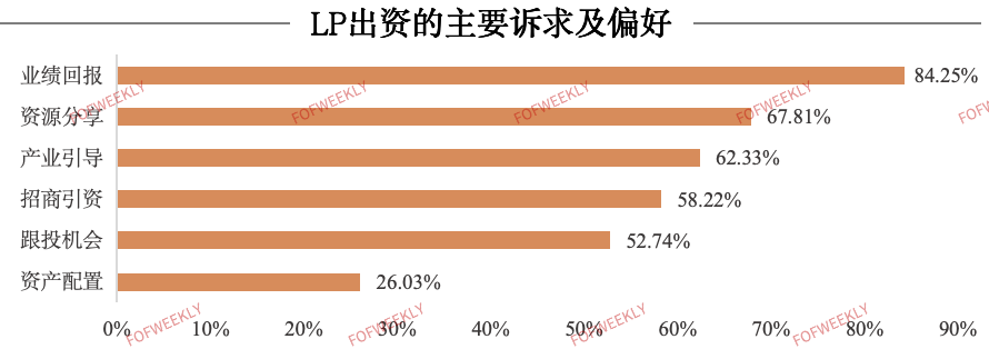 抛开基金管理费的收取模式变化,LP对GP功能属性要求的提升也是市场一大明显的变化。我国私募股权市场的资金端成分复杂,诉求相对不统一,这对管理人提出了更高的要求。近来年,LP除了财务回报之外,其他各类诉求愈发明确和多样化,这也要求GP具备更强的功能属性。根据FOFWEEKLY《GP生存发展报告2023》中披露的调研数据,除了业绩回报之外、要求资源分享、产业引导、招商引资和跟投机会的LP占比达到半数以上。