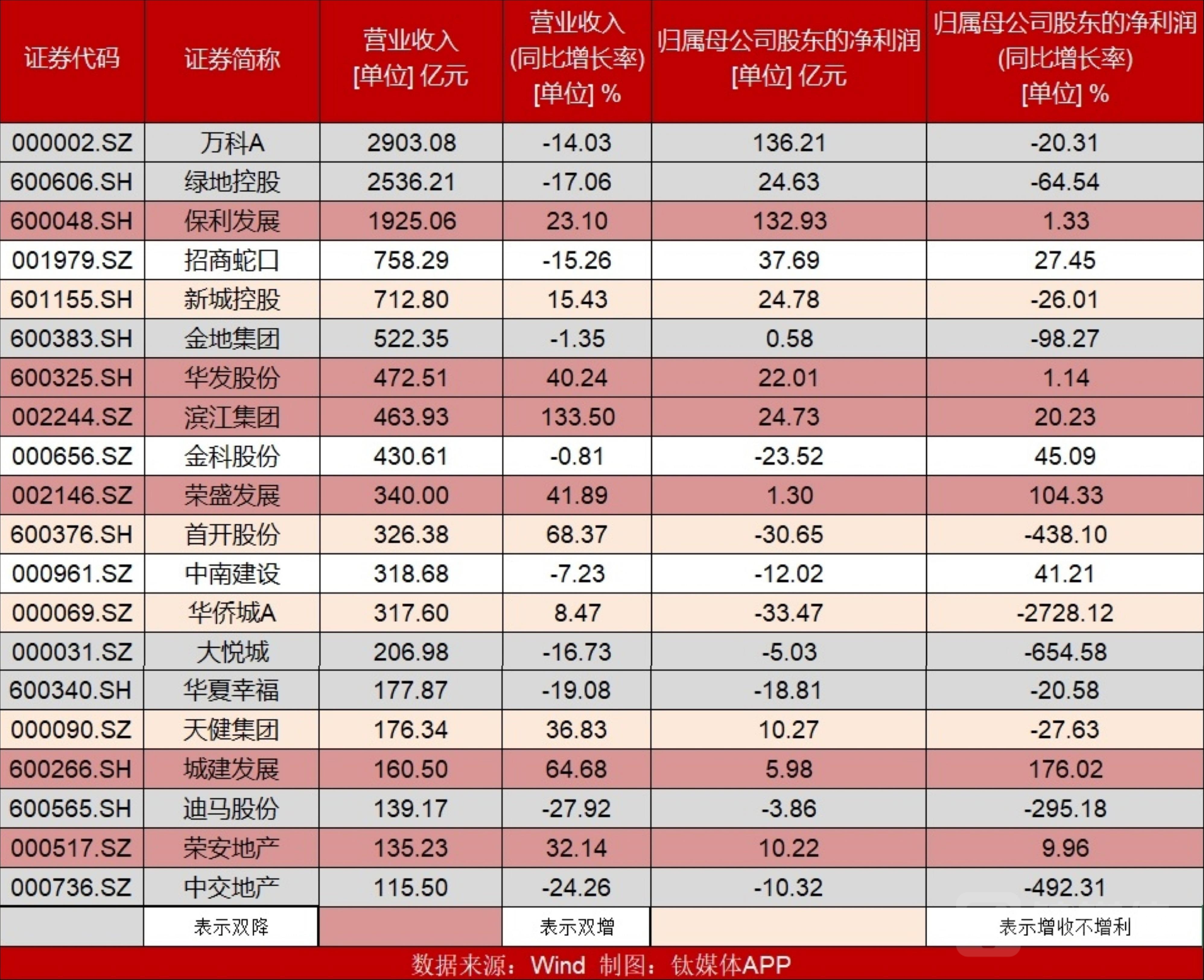 综合营收和净利来看,A股有36家房企出现营收和净利润双降,占比超三成,头部企业也未能幸免。营收TOP3的“万绿保”仅有保利发展一家实现业绩增长,万科和绿地控股净利润同比分别下跌20.31%和64.54%。万科作为A股龙头房企,多年来一直被视为业内标杆,但近日万科也因境内外债券大跌深陷舆论风波,随后万科方面进行紧急回应,称公司基本面没有出现任何问题,债券异动主要是市场情绪波动所致。