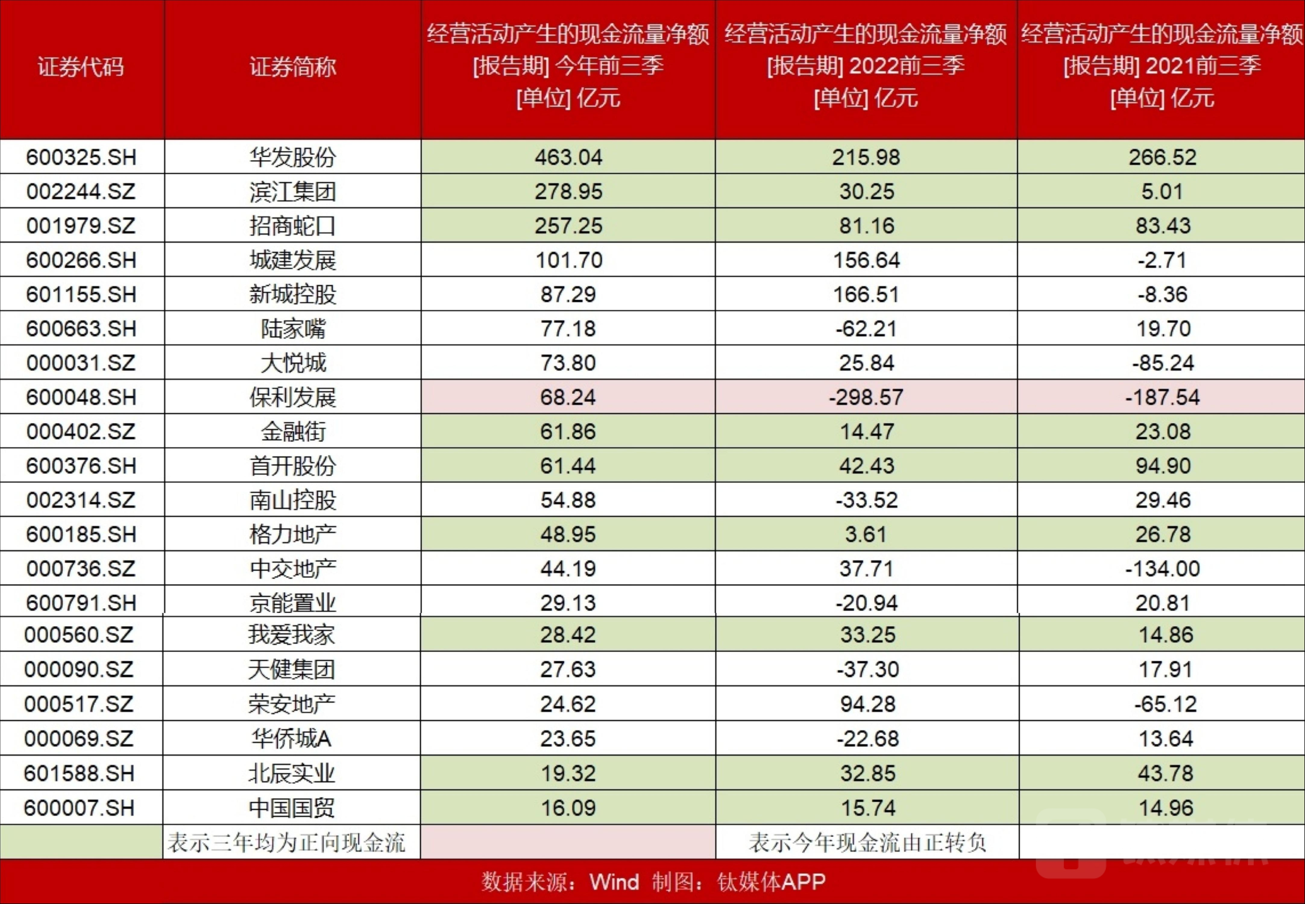 据钛媒体App梳理的A股109家上市房企财务数据,今年前三季度共有51家房企经营活动产生的现金流净额为负数,这就意味着近半数房企或需要通过存量资金或者新的融资渠道来偿还债务支出。Wind数据显示,经营性现金流最高的三家房企分别为华发股份、滨江集团和招商蛇口,金额分别为463.04亿元、278.95亿元和257.25亿元。经营性现金流最低的三家分别是:浦东金桥、上海临港和京投发展,金额分别是-65.98亿元、-64.05亿元和-49.93亿元。