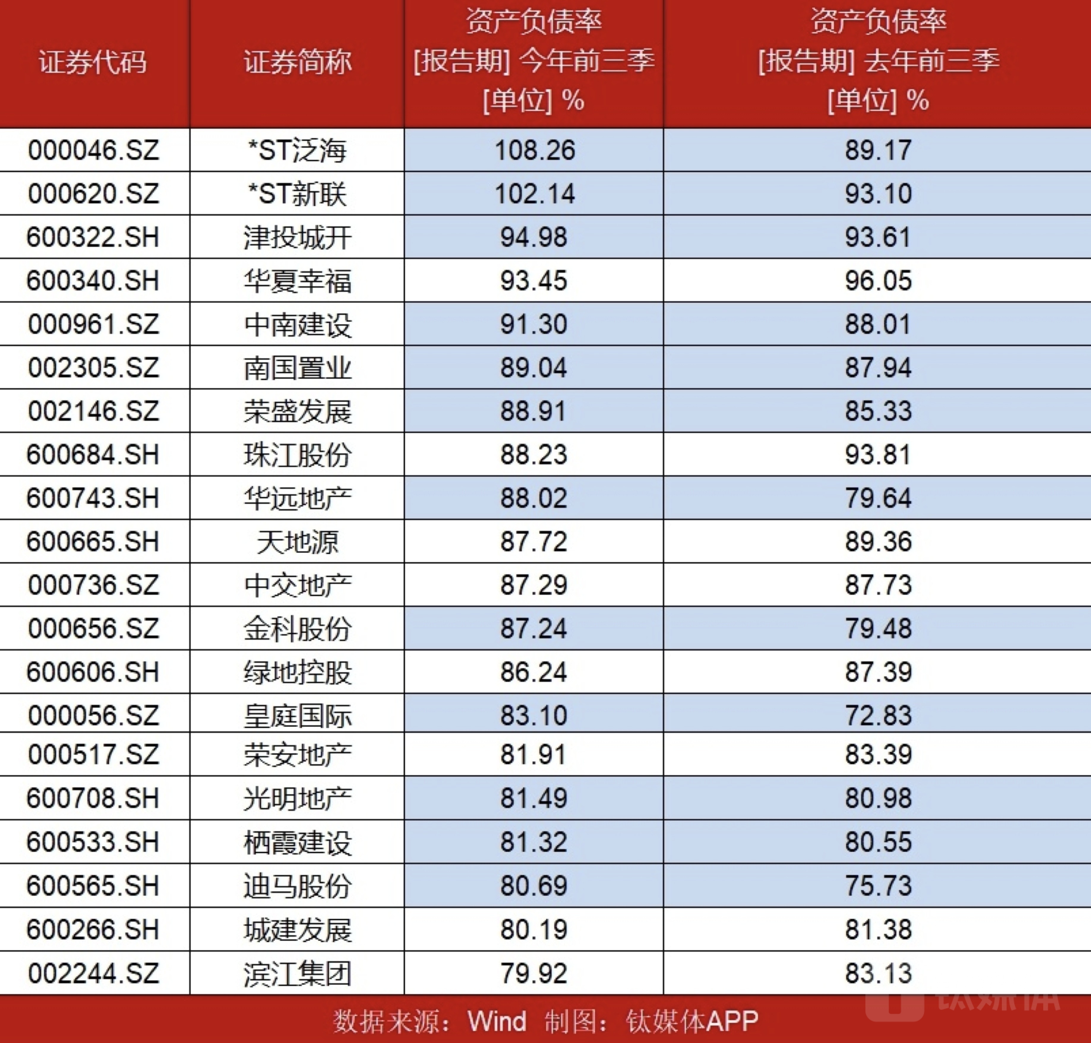 图:A股房企前三季度资产负债率TOP20