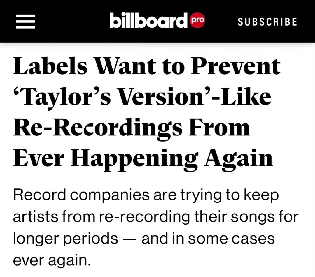 据Billboard所了解到的消息,通常允许重制的等待期限已经由发行后的5-7年不等,延长到10年、15年乃至30年,甚至可能永远不允许歌手自行重制专辑,以将录音版权牢牢掌握在唱片公司手中。