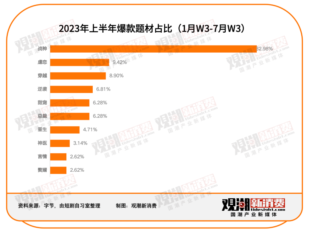 从题材来看,微短剧可以像网络小说般简单粗暴地分为两类:女频向和男频向。针对男性用户的是战神、逆袭、重生等题材,针对女性用户的则是甜宠、总裁、言情等。根据短剧自习室总结的数据,在今年上半年的爆款微短剧里,90%的题材仍然以“爽”为主,如战神、穿越、逆袭、重生等。